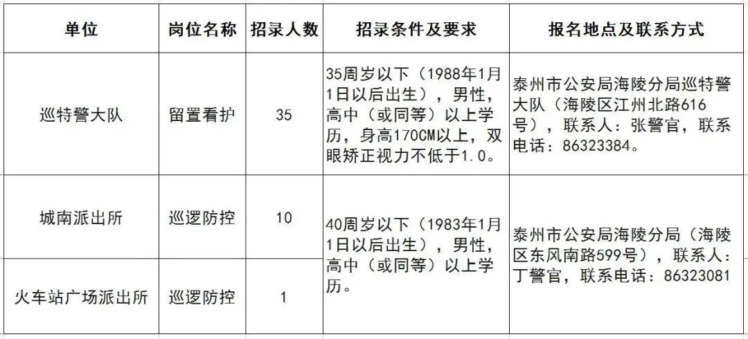 因工作需要,泰州市公安局海陵分局決定面向社會(huì)公開招錄警務(wù)輔助人員?,F(xiàn)就有關(guān)事項(xiàng)公告如下: