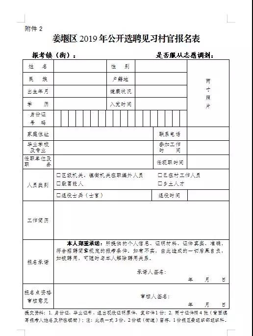 報名方式:符合條件的報名人員需攜帶本人有效居民身份證、戶口簿、學(xué)歷畢業(yè)證書、退出現(xiàn)役證明原件及復(fù)印件、兩寸證件照5張到擬報考的鎮(zhèn)(街道)報名點報名,填寫《姜堰區(qū)2019年公開選聘見習(xí)村官報名表》(見附件2)報名。原則上只能報考戶籍所在鎮(zhèn)(街道)或緊鄰鎮(zhèn)(街道),報名時需表明是否服從志愿調(diào)劑。