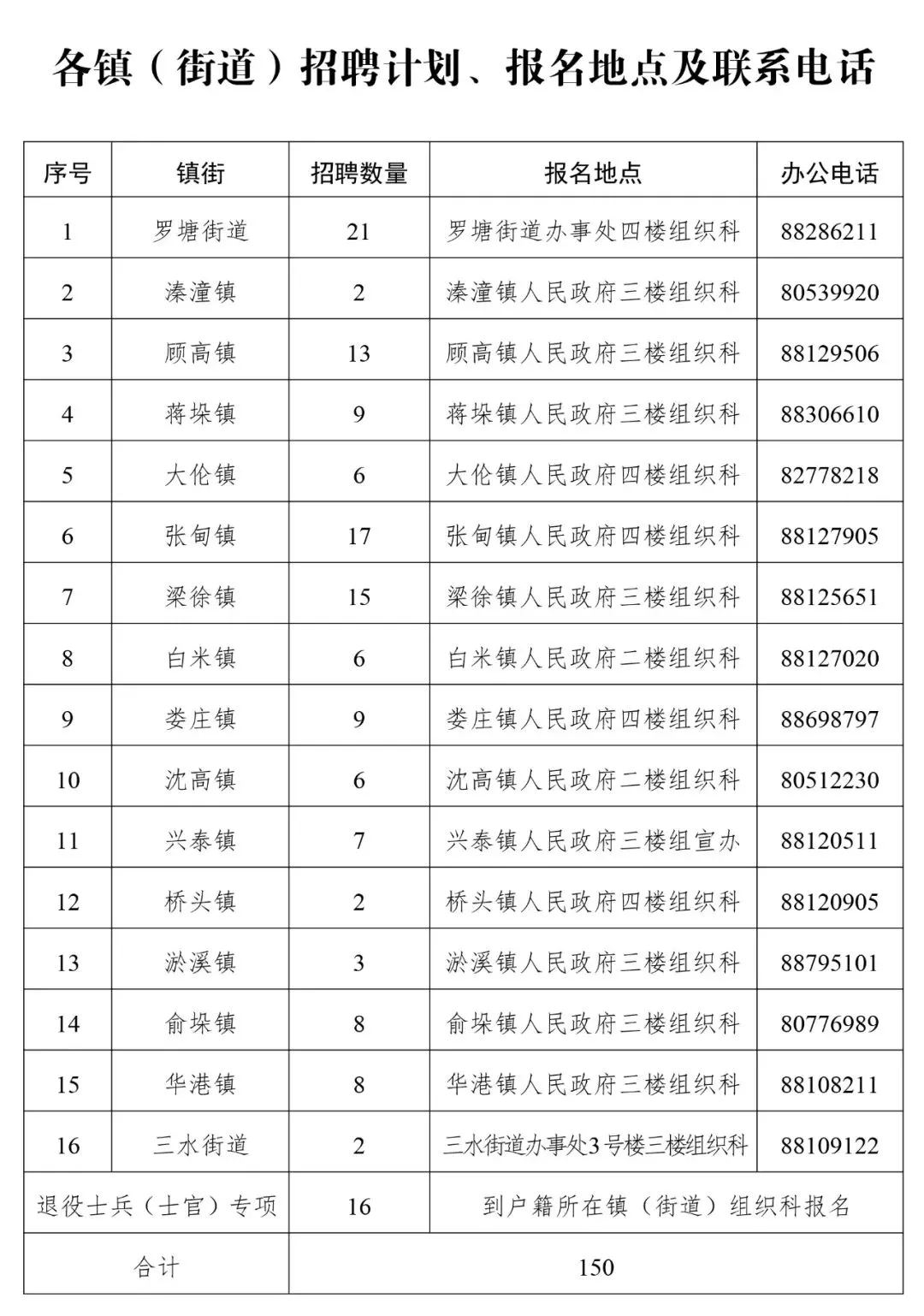 計劃選聘150名,其中:各鎮(zhèn)(街道)選聘134名;從2016年-2018年退役的士兵(士官)中專項選聘16名,(具體選聘計劃數(shù)量見附件1)。